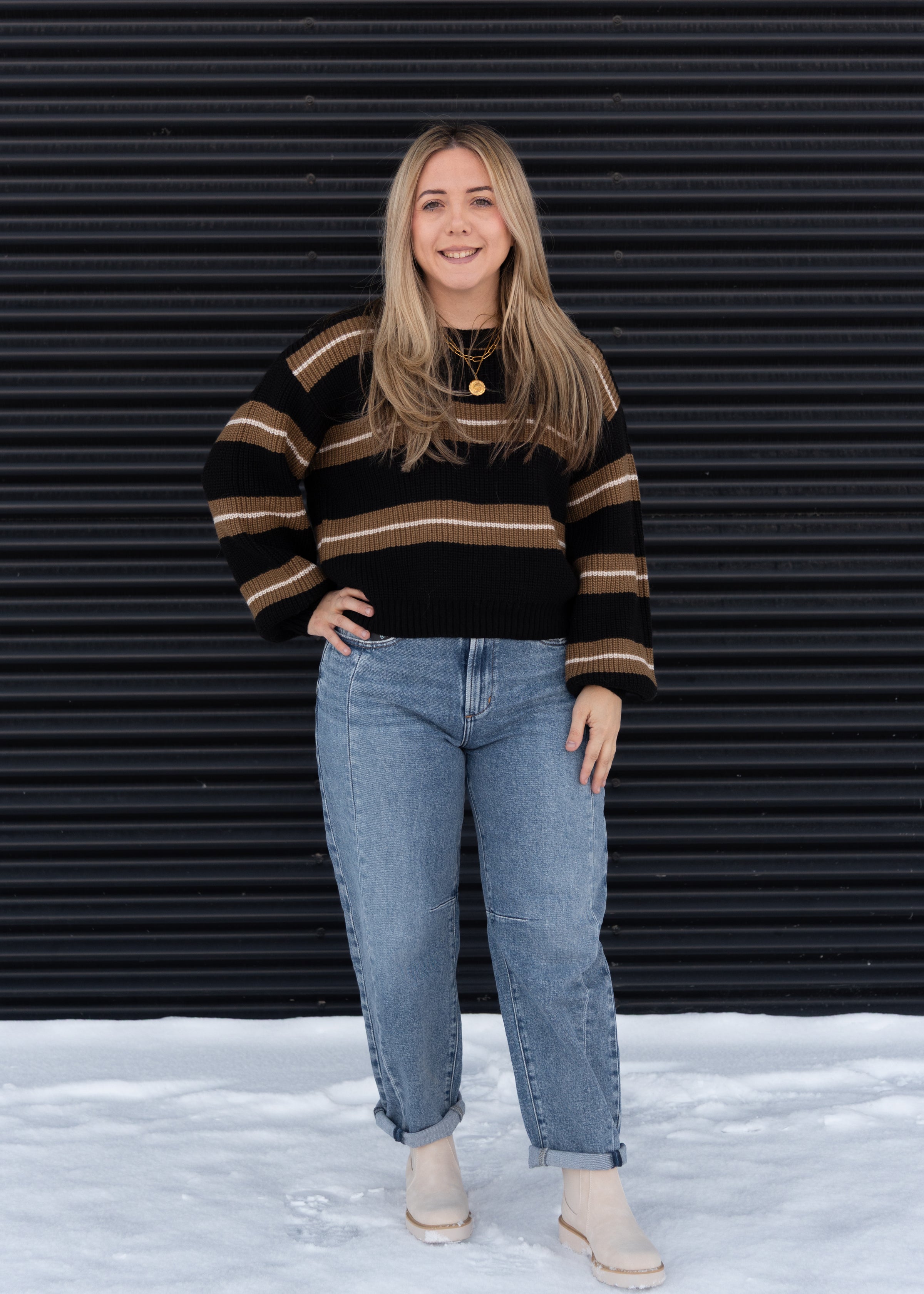 Introducing the Mimi Black Sweater—your new go-to for cozy-chic vibes! This beauty rocks a bold wide stripe pattern paired with oversized sleeves that gather sweetly at the wrist, giving you that effortlessly cool look. The high neckline and flowing silhouette wrap you in comfort without sacrificing style. Whether you're lounging at home or stepping out for casual adventures, this sweater delivers the perfect blend of relaxed charm and refined elegance. Snuggle up and let your wardrobe do the talking!